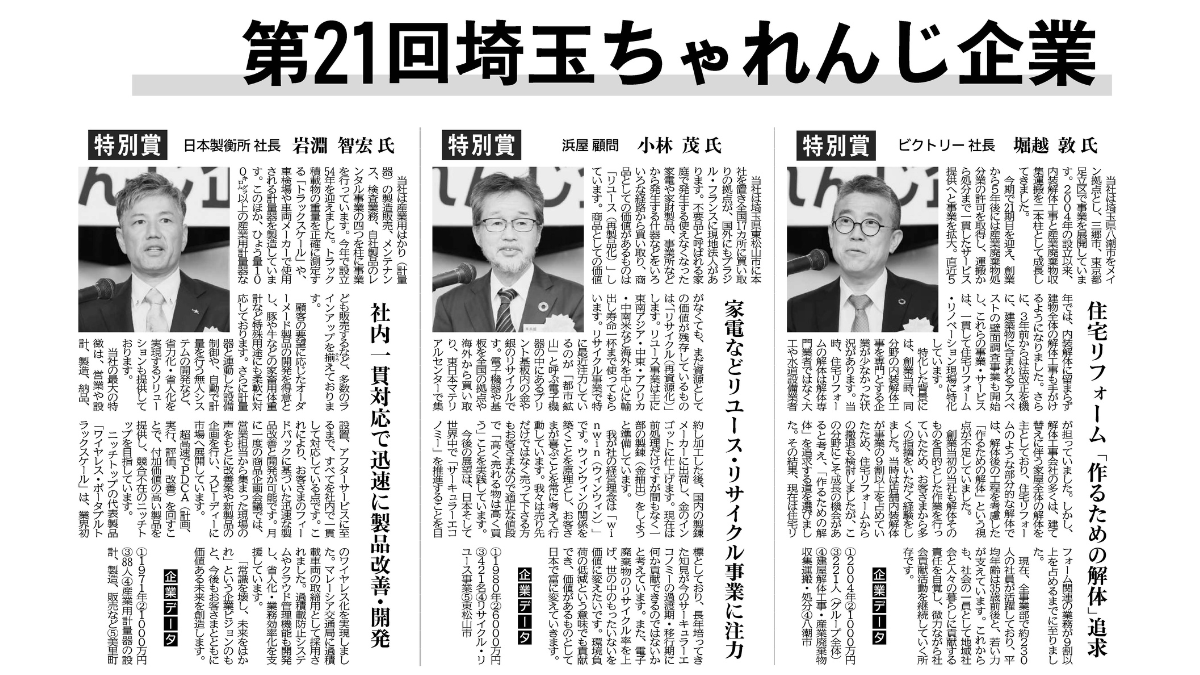 2025年5月30日発刊の『日刊工業新聞』にて、当社が「埼玉ちゃれんじ企業経営者 特別賞」を受賞したことが紹介されました。