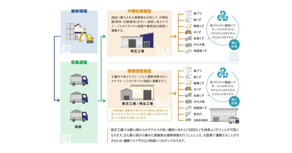 パネル・写真展示により、部分解体からスケルトン工事までの施工事例や、当社の強みである「造るための解体」の考え方をご紹介します。現場を担当する解体スタッフが常駐し、品質管理や施工方法について直接ご説明いたします。 - 産業廃棄物の収集運搬及び処分